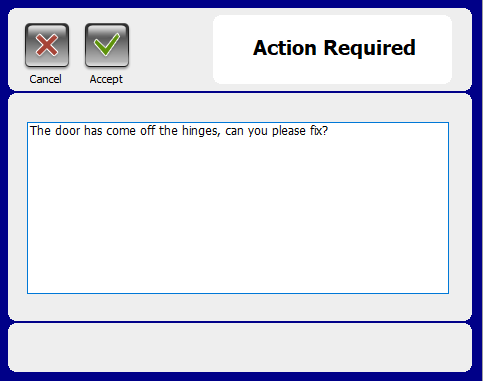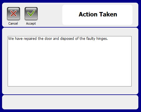 5) The solutions area contains the date of completion, how many hours it took and the feedback rating from the Requestor. Operatives can also outline what actions they took to complete the Job Request. Complete the Action Taken field you can click and open a dialog window to populate with information. Directly below this area is the overdue display. If a Job Request is not completed by its priority due date, then it will be deemed overdue and the number of days is displayed there.