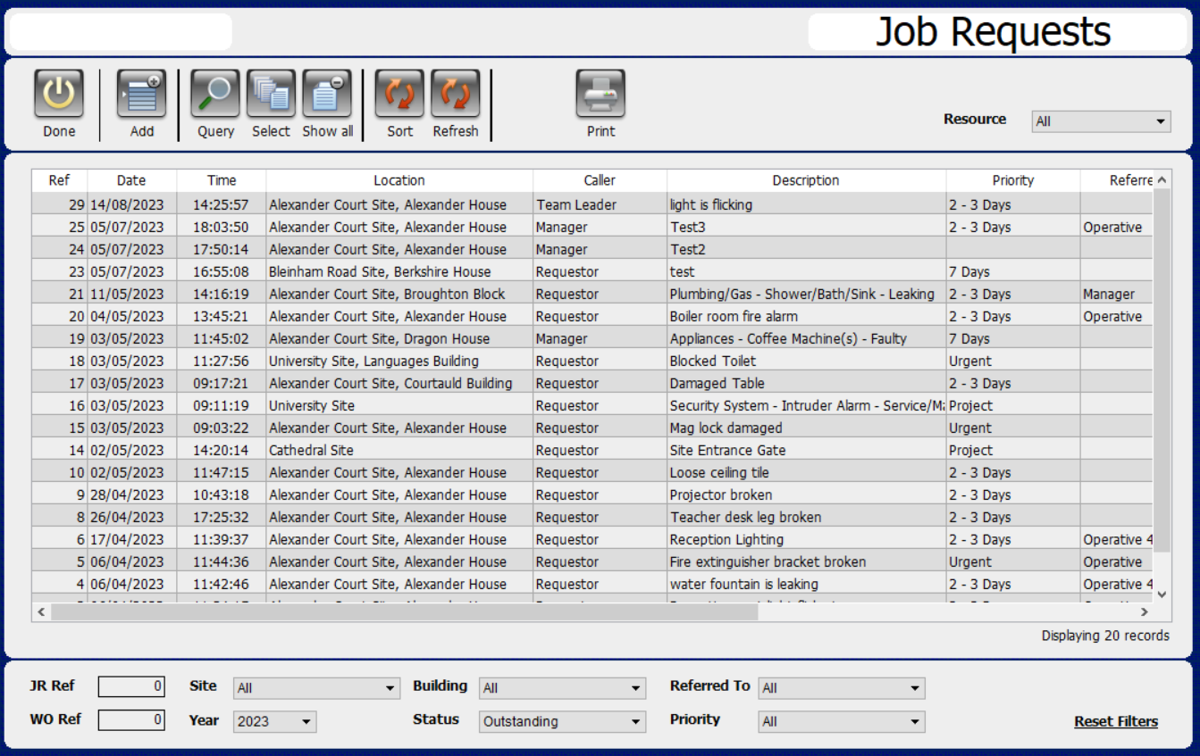 The new dialogue window will appear along with the next reference number in the sequence. You will then need to enter all the information about that Job Request into the required fields.