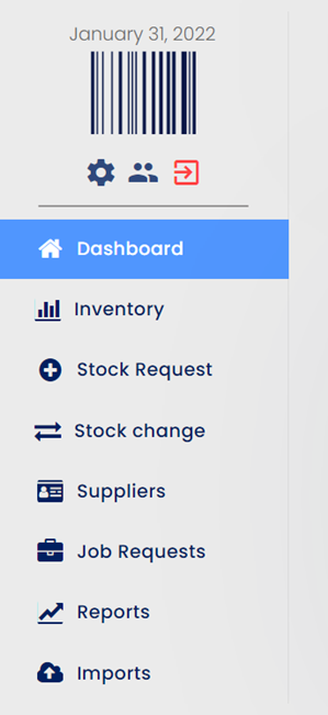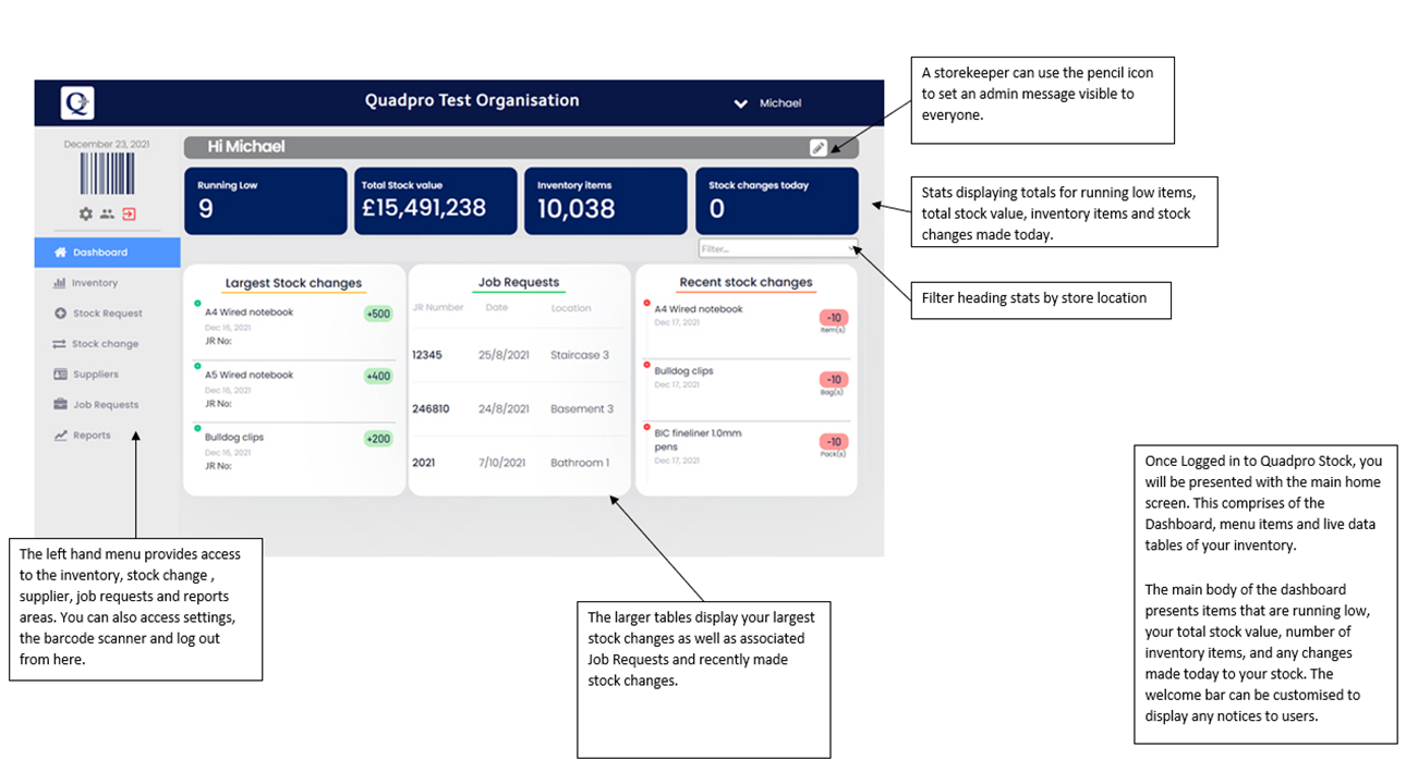 Once Logged in to Quadpro Stock, you will be presented with the main home screen. This comprises of the Dashboard, menu items and live data tables of your inventory.